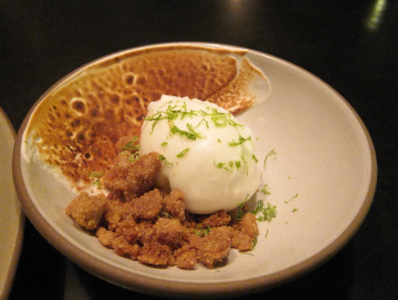 Frozen lime yogurt, graham crumble, toasted meringue. Our second dessert and final dish of the night was this bowl of super tangy frozen lime yogurt. This had a key lime pie-like presence and taste with the graham crumble and toasted meringue. I like how the meringue was "brushed" along the inside of the bowl. A nice, light dessert to end the night.